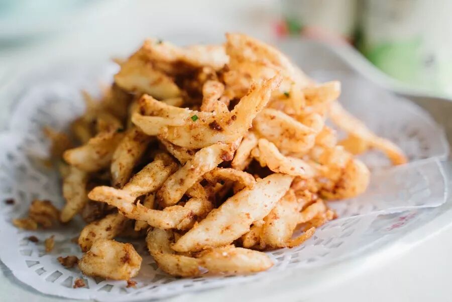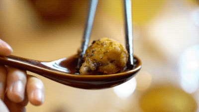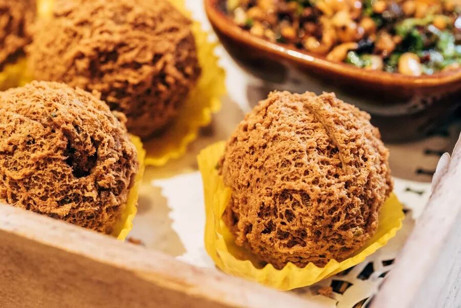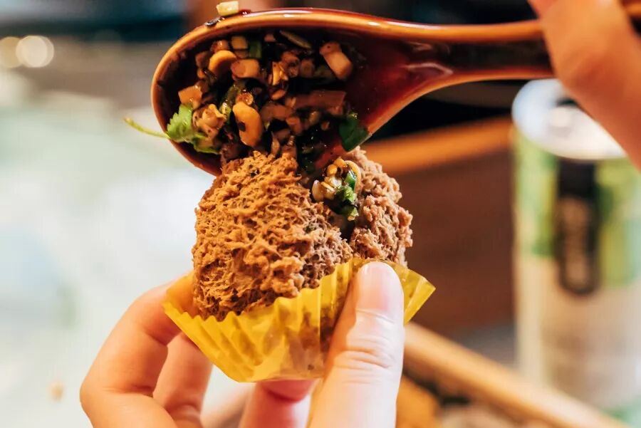 接着就可以往你的大嘴里一送:外壳的酥脆让人惊艳赞叹,偏偏里面又是热腾腾的嫩豆腐泥,口感立体丰富有层次。味道有点儿像臭豆腐,但不臭。搭配的蘸水,酸辣咸鲜都有,画龙点睛的一笔 ▼