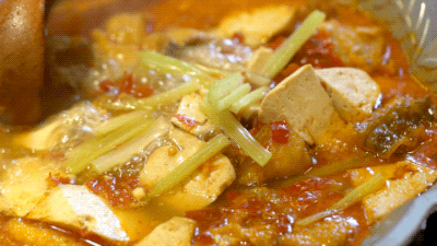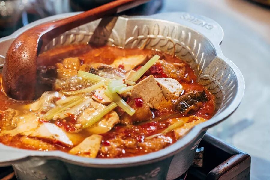 一锅具有农家乐气质的鱼。沧桑的老豆腐,略带酸头,但熬得非常入味。乌江鱼的做法接近爆鱼,外韧里嫩,糟辣味正,酸度适中。