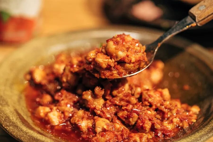 云南人民用糍粑辣椒炒辣子鸡,这一家的鸡丁切得特别细碎,辣椒红彤彤的,显得“油光满面”,浸透红油的鸡丁,嫩。闻起来就让人食欲大开,内心叫嚣着“米饭呢!米饭呢!给我米饭啊”!