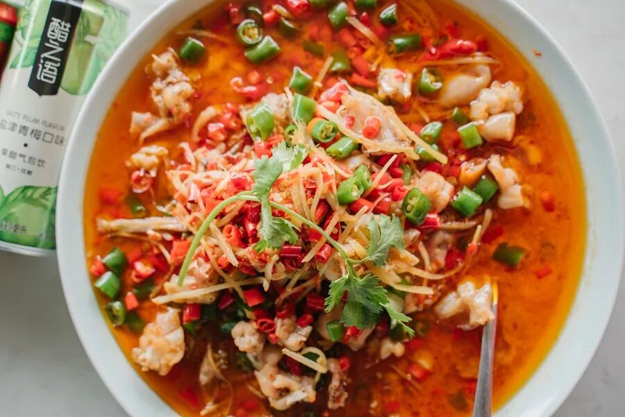 这一盘牛蛙,辣的过瘾带劲,不太能吃辣的朋友可以搭配盐津青梅口味的醋之语,解辣效果很赞,而且青梅酸丝丝甜津津,无比开胃。