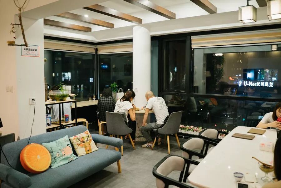 公寓改成的小馆子,有两大面落地窗,让人有种观光的错觉,外面流光溢彩,里面是热火朝天。