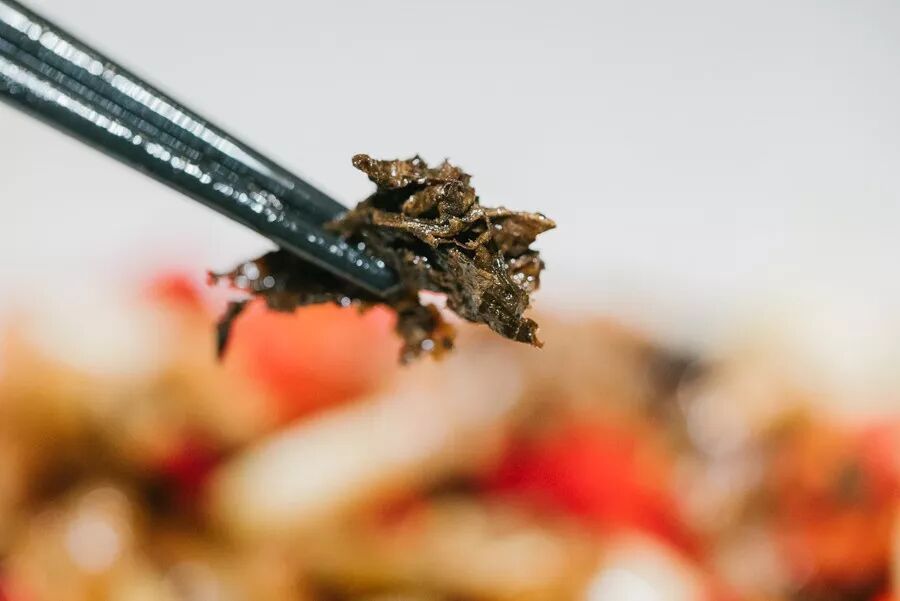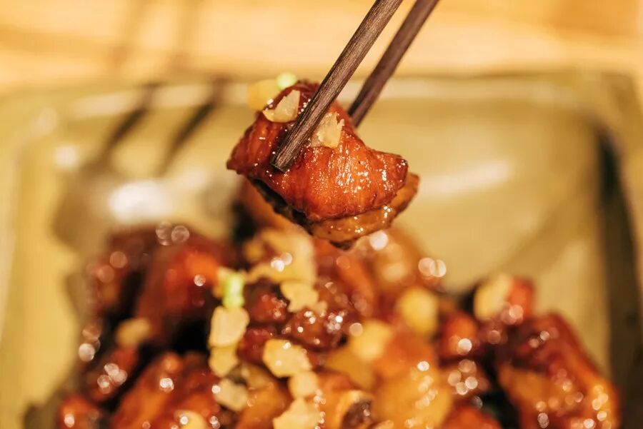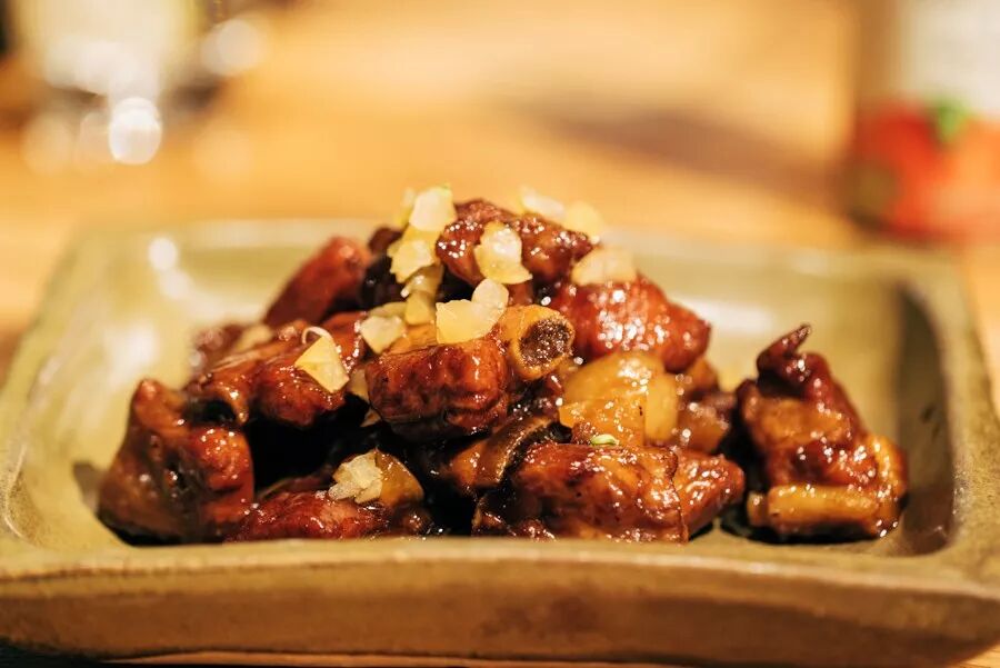 见面第一眼,呛,一种隐隐的迫近感,内心大呼不好……卖相是街边黑料那样,烧的火候足,调味重,带着一种爆炒过的气质,油亮馋人。
