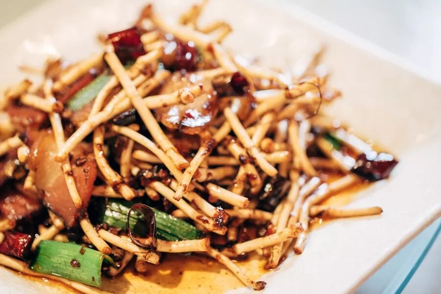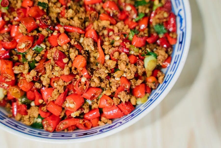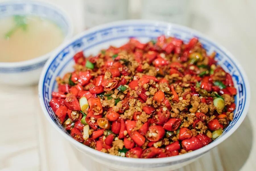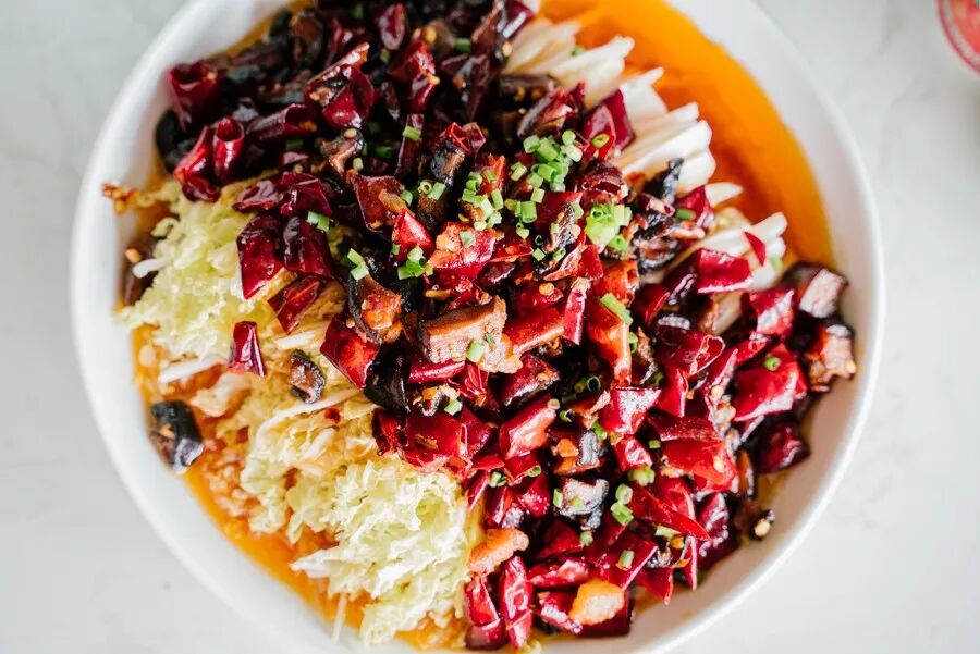一道平日里清汤寡水的娃娃菜,在四川厨师的手里也变得令人生怯……这满谷满垛的辣椒,比生菜看着还多。不过,里面还掺了香菇丁和猪油渣,更香啦~