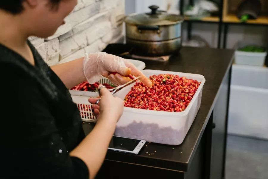 因为进门的第一感受就是呛,弥漫在空气中的辣椒味道,钻进鼻子,连打了几个喷嚏。回头一看,原来有阿姨妈妈在剪辣椒。