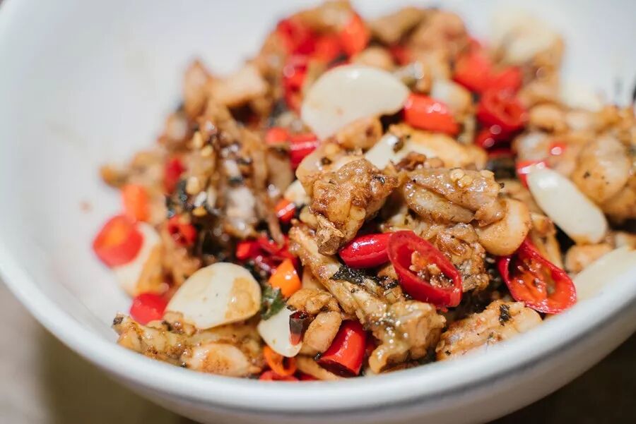 鲜辣咸香,味道真的特别足够。红绿相掺的辣椒,辣的有力度,从口腔喉头一路带着热意进到胃里,过瘾!牛蛙切得块儿有点小,不过丝毫不妨碍它的嫩和鲜,吃起来只会更加有味。