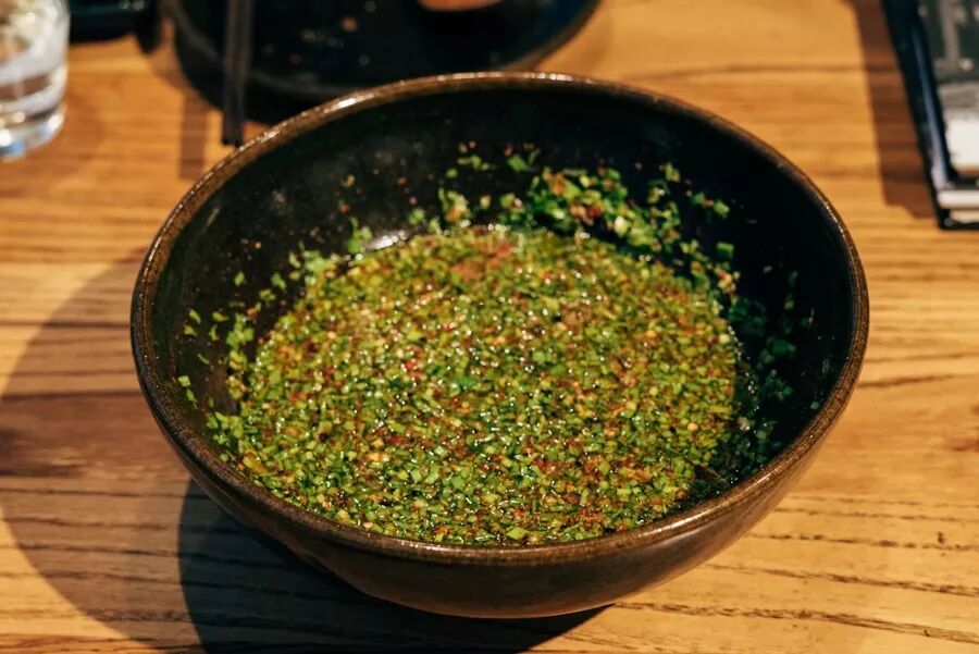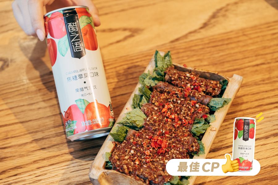 这道菜本来只有一层辣酱,因为知道我们想吃点辣的,店家给我们又加了点儿小米辣。你别说,这辣椒听着很温柔,后劲儿也太足了,必须猛灌一口焦糖苹果味的醋之语。辣味迅速消散,而嘴里留下的一点点薄荷气息,让甜酸的饮料,变得更加清爽~