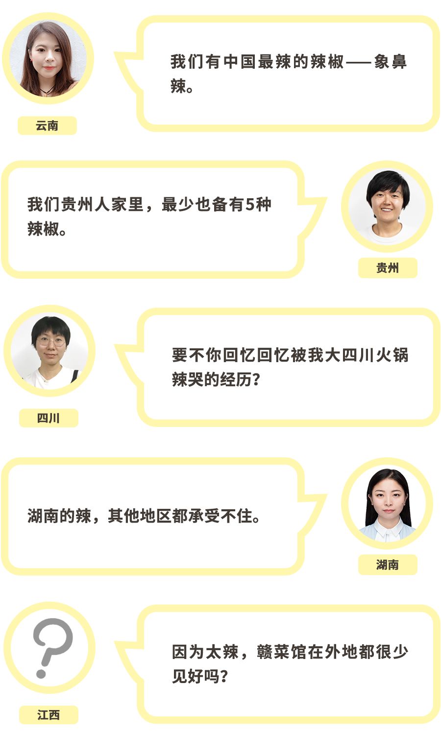 说到“辛辣食物”,可引起了局里几位探员的battle,来自云贵川湘赣的探员们,为了谁的家乡最能吃辣,争得是“面红耳赤”。