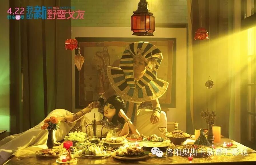 电影《我的新野蛮女友》中宋茜饰演的新野蛮代言人星星野蛮直爽,在外人面前对车太贤饰演的牵牛君打骂不断,笑料百出,在家中则小女人情怀尽显,擅用别样趣味的手段促进夫妻和谐生活。这组海报取材于影片情节,再现电影中星星与牵牛乐趣无穷的爱情,把背景设置在三个不同场景内,并让主角造型以二次元的卡通形象出现,二人穿越到戏曲舞台上扮演包大人及其娘子,在老上海上演另类花样年华,更出现在古埃及变身埃及艳后和法老,笑果十足,情趣无限。