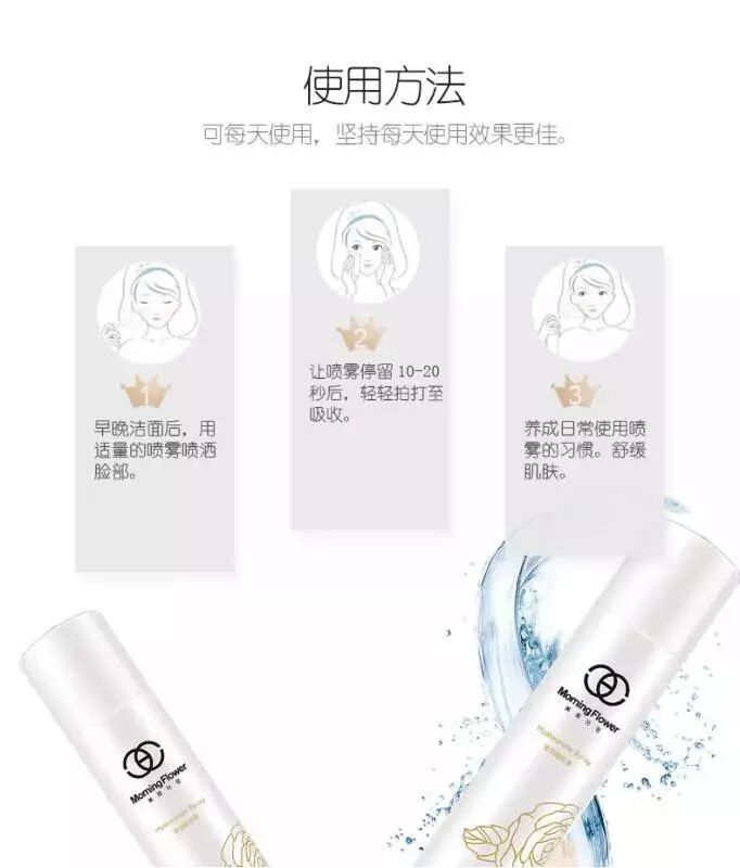 美丽符号玻尿酸喷雾,在肌肤感到干燥时,闭上双眼,距离肌肤20cm,喷洒于脸部,并且轻拍吸收。化妆前后均可使用。