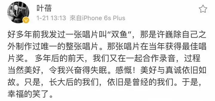 不知道许巍是如何突然明白的,但那段时间之后,他找到了自我,其中必然少不了叶蓓的帮助,在她身上,有一种沉静和安宁,就像她的歌一样,平静而温暖,这无疑是治愈抑郁症最好的良药,这个朋友,许巍一交就是几十年,至今能请动许巍的女歌手,除了姜昕,只有叶蓓。