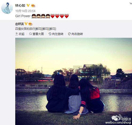 而林心如也第一时间回应了舒淇的微博,四个女孩表情+四个爱心,似乎心情大好。