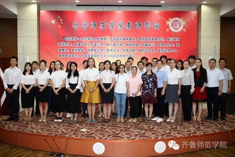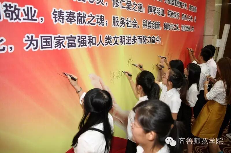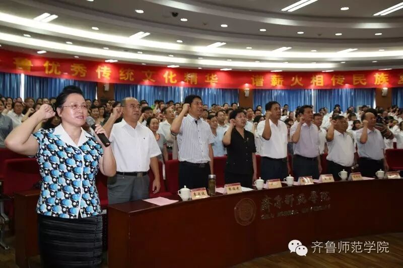 在国务院特殊津贴获得者、山东省优秀教师和师德标兵、马克思主义学院陈海燕教授的带领下,全校700余名教师紧握右拳,面向国旗庄严宣誓:“我志愿做一名光荣的人民教师,忠诚党的教育事业,贯彻国家教育方针,履行教师神圣职责。尊重个性,关爱心灵,修仁爱之德……”,用铿锵有力的声音许下了自己庄严的承诺。