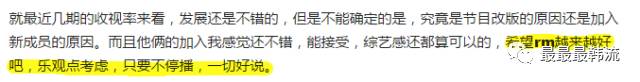 所以水君认为,以新鲜刺激打动观众绝非长久之计,如何在保障稳定收视的同时,让RM回归正能量、有温度的高口碑是当前节目组需要考虑的问题,对此水君期待RM的日后表现!