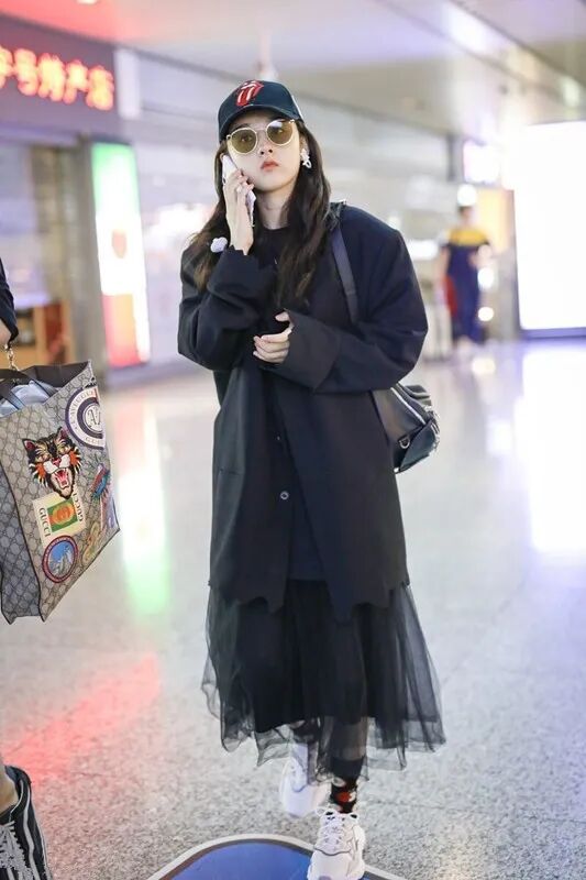 灰色是十分经典、中性显成熟的颜色。任家萱这一套显得过分宽大的灰色宽肩西装+灰色拖地阔腿裤,把自己装扮得十分成熟稳重。宽阔的大垫肩,衬得头小脸小,大V领内搭一件白色裹胸,非常巧妙地拉长了脖颈线条,十足显瘦。因为衣服过于宽大,所以她将袖子挽起半截,露出胳膊,两粒扣也只扣了一粒,更添洒脱随意。
