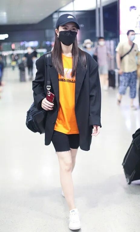 这件黑色西装有着极夸张的宽肩垫,下身配着一条骑行短裤,那就得非常注意要敞开纽扣,不必规整的全部扣上,这样露出亮橘色的字母T恤+黑短裤+小白鞋,会很好的避免头重脚轻,看起来显瘦帅气。