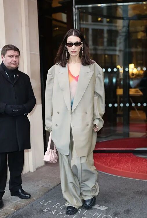 宽肩西装一般都带有稍显宽张的垫肩设计+oversized的版型,垫肩能使肩膀线条更为平直挺括,优化头肩比,显头小脸瘦。而oversized的版型非常藏肉,即使上半身赘肉较多也能轻松驾驭,分分钟就能get到洒脱率性的大女人气场。