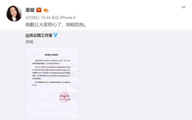 早在事发之初,董璇就很勇敢坚定的站出来,在微博上转发高云翔工作室的声明,并回应自己相信他。