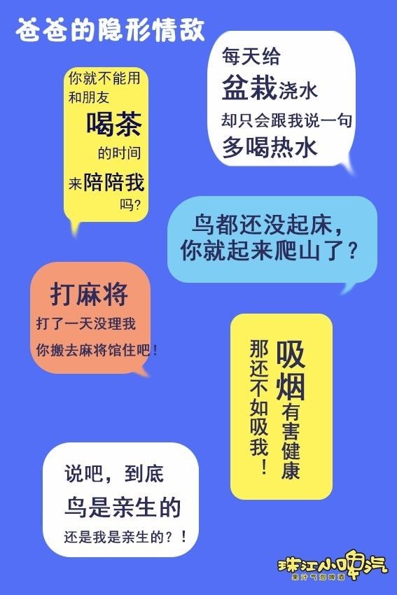 老爸的茶友,老爸的盆栽,老爸的鸟,老爸的山,老爸的麻将,老爸的烟......