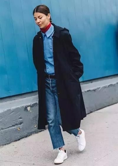 蓝色衬衫穿在红色高领毛衣外,搭配牛仔裤和黑色风衣,露出的小面积红色高领恰好点亮身上色彩。