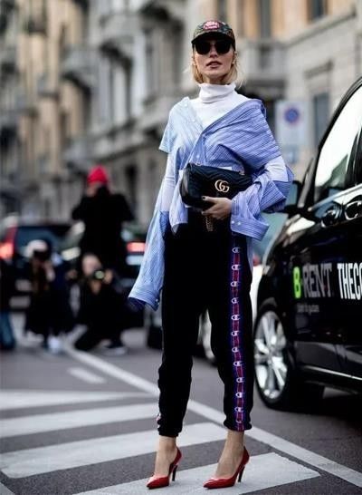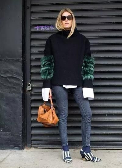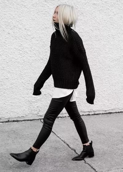 高领针织衫的穿搭点就在于露下摆,衣袖。小部分的露下摆显得随性。
