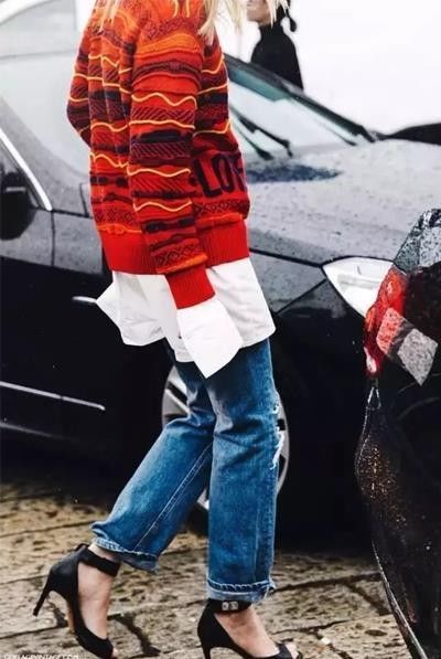 oversize的廓形毛衣叠穿衬衫,穿起来给人一种不太过正经,又比较慵懒的感觉。廓形毛衣叠穿overzie大衬衫便是时髦~