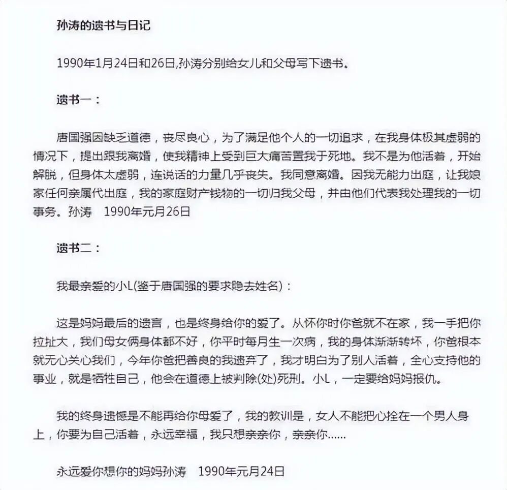 她在遗书中指责唐国强对婚姻不忠,还劝告女儿唐莉为自己报仇。