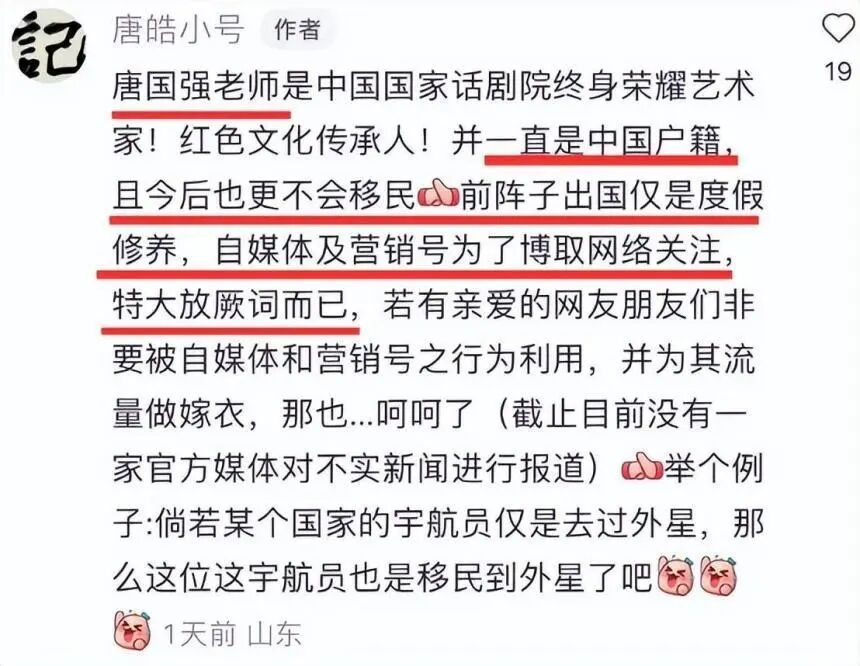 他解释唐国强夫妇出国是因为有公事在身,移民美国什么的都是无稽之谈。