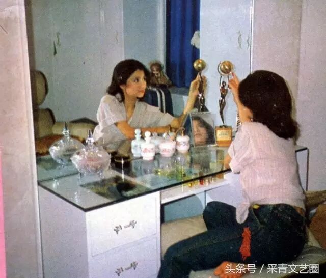 梳妆台,上面还有不少摆件,她正用手抚弄得来的奖品,她把这个奖品放在这个地方,估计就是在早上照镜子的时候,给自己更多的信心