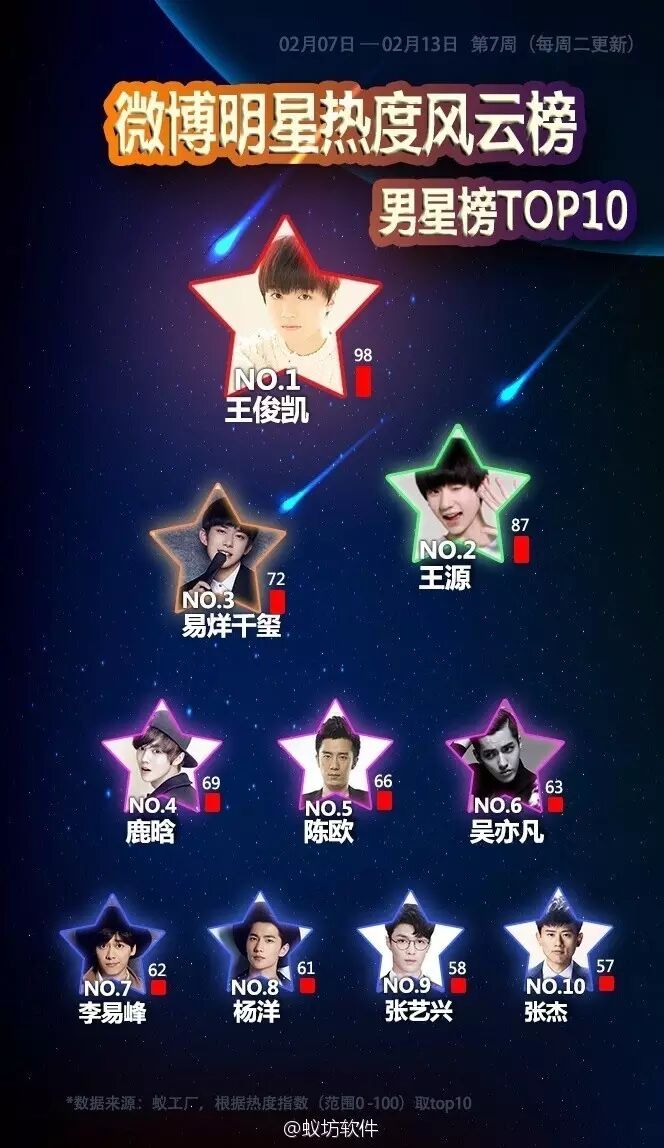 #大数据看微博#(2月7日-2月13日)男星榜热度第一位@TFBOYS-王俊凯 ;第二位@TFBOYS-王源 ;第三位@TFBOYS-易烊千玺 ;第四位鹿晗@M鹿M ;第五位@聚美陈欧 ;第六位吴亦凡@Mr_凡先生 ;第七位@李易峰 ;第八位@杨洋icon ;第九位张艺兴@努力努力再努力x ;第十位@张杰 #微博明星风云榜#