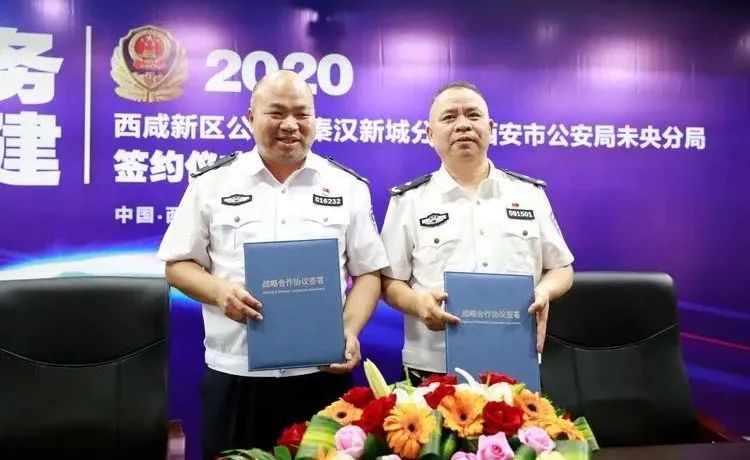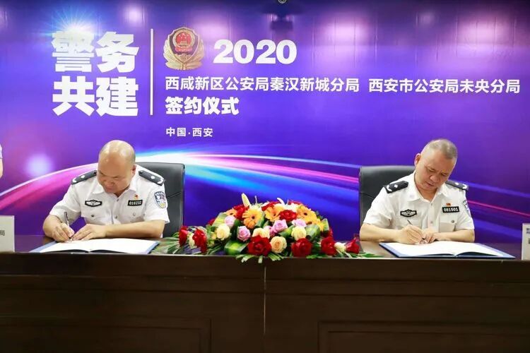 在热烈的掌声中,西安市未央区副区长、未央分局党委书记、局长魏随康和西咸新区公安局秦汉新城分局党委书记、局长薛国旗共同签署了《西安市公安局未央分局与西咸新区公安局秦汉新城分局警务合作框架协议》。