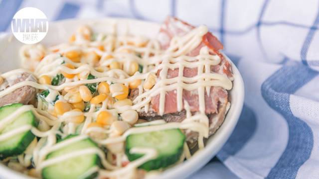 营养瘦身牛肉丸沙拉:牛肉丸,三文鱼,烟肉,虾仁,玉米,青瓜,沙拉酱。夏天瘦身必备明星产品,补血调理气血之余还能瘦身。