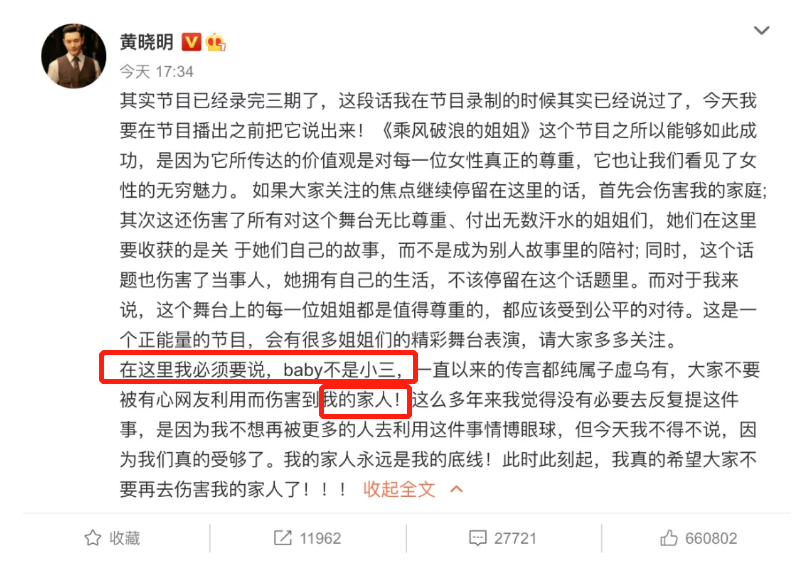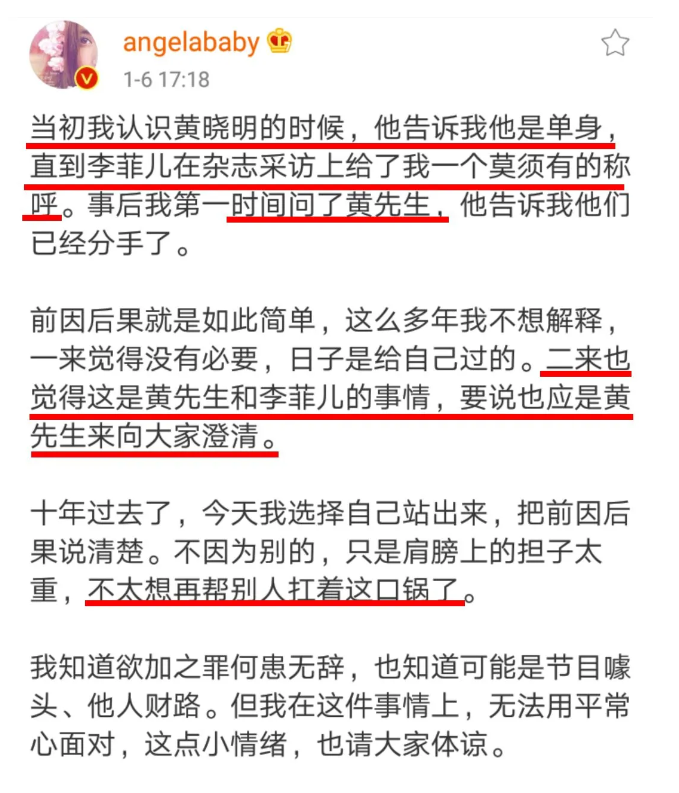 Angelababy怒撕,黄晓明慌了:10年被小三后,她果然想离了? 妈妈网育儿 港台女星 2021-01-08 12:23:45 1034 创作不易,用心坚持,欢迎请BaGua喝几杯爱心咖啡!打赏并支持本文 打赏并删除本文 点击上方☝蓝字,关注妈妈网育儿不是每一段感情都能百分百白头,但一定要时时刻刻保证自己有潇洒离开的底气。作者 | 李耳耳来源 | 妈妈网育儿(ID:mmwyuer )0110年嗑的糖,都熬成了难堪2021年才过去了8天,娱乐圈就来了个大瓜。不是捕风捉影的偷拍,而是正主亲自下场爆料,精彩程度令人拍手叫绝!事情是这样的:前不久,《乘风破浪的姐姐》第二季正式开录,主持人依旧是黄晓明,但凑热闹不嫌事大的节目组,请来了教主前女友李菲儿。黄晓明李菲儿同台,观众立马尖叫;李菲儿一句“晓明哥”,全场激动得跺脚。熟悉的读者可能会知道,李菲儿、黄晓明、Angelababy之间,有一场关于Baby到底是不是小三的“辩论”。谁胜谁败我们等会儿说,先看大瓜。老公和前女友同台后,眼看自己当初的黑料又要被扒出,baby决定先下手为强,直接发微博公告:我不是小三。总结一下。第一段:我不是小三,就算是,也是黄晓明骗了我。第二段:黄晓明没有担当。第三段:感情好的时候我能忍着,现在感情淡了,别想让我背锅。第四段:李菲儿想利用我赚钱,没门。刚读完第一段,就有很多吃瓜群众把矛头指向了黄晓明。果不其然,十六分钟后,他带着澄清“姗姗来迟”。一句“baby不是小三”,也算是给了一个定论,还baby一个清白。当年的风波究竟是怎样的呢?2007年,李菲儿被拍到与黄晓明一起逛街。当时没有人承认,事情也就不了了之。结果一年之后,他们又被拍到亲密进餐,黄晓明还在车里搂着李菲儿的腰。2007-2009这三年,二人一直没闹过什么不快,也算是进展顺利。直到黄晓明遇到了baby,有传言baby在和黄晓明约会。当时baby还和陈伟霆在一起,毒舌港媒对黄晓明用了“第三者”的称呼。然而,霸道总裁怎么能咽的下这口气?他先觉得心虚,顾左右而言他:“基本上,所有男人都喜欢baby这个类型,而我……是男人!”然后此地无银三百两:“我不知道陈伟霆是谁。”一通操作过后,反而越抹越黑,让人觉得更加可疑。就这么僵持了大半年,baby先是被曝出探班黄晓明,然后又在微博暗暗传情。李菲儿倒是显得很平静,没有什么水花。海绵蛋糕音同粤语版晓明大哥2010年6月,黄晓明终于默认,与李菲儿分手,baby是现任女友。原以为事情会就此落幕,没想到,精彩的还在后头。一年之后,李菲儿突然发难,在接受采访时直接曝出:是baby抢人。甚至还描述了baby的“上位”短信:“我要的是一个男朋友,不是sex partner(性伴侣)!”一石激起千层浪!哪怕baby不断起诉造谣的人,黄晓明发文称李菲儿是炒作,还是止不住吃瓜群众的好奇心:你拿人家当男友,人家觉得你是sexpartner,Baby在这段感情中,真的这么卑微???如今回头再看这段“霸道总裁爱上我”般的恋情后,才发现baby的公主之路,其实一直走得不太顺。02当年一句“配不上”,成了婚姻的摆设品?和baby擦出火花的时候,黄晓明不仅是顶流男星,还高调入驻华谊,董事长亲自出席仪式欢迎他。而baby只是一个名不见经传的香港小嫩模,唯一拿得出手的经历,是给周杰伦当伴舞。不能势均力敌,也就意味着这段关系中,始终有人占上风,有人受委屈。虽然baby靠着黄晓明签约华谊,打开内地市场,和张学友谢霆锋一起拍电影。但她付出的代价是,始终扮演一个乖乖小女孩,满足黄晓明的霸总情结。开心了,在节目中秀秀恩爱,虽然他口中的baby“什么都不是”:“别人都说baby配不上我,我已经在一个很高的点了,她什么都不是。她家条件不好,受了很多苦,她一见到我就想嫁给我。”在停车场里,不高兴的时候,叉腰责骂,最后自己开车扬长而去,留下 baby一个人。Baby在他眼中,更像是一个漂亮听话的娃娃。记得在《娜就这样说》中,谢娜问黄晓明为什么选择baby,他只说了几个字:“漂亮,好看。”还是在谢娜的追问下,才干巴巴地挤出性格层面的评价:“乖巧,可爱,我妈喜欢。”于是,这个懂事的女友,能在节目中对他娇滴滴地撒娇;也能在他上《跑男》的时候,一改爽朗女汉子的人设,故作柔弱,迎合对方的胜负欲。哪怕黄晓明因丑闻上了热搜#黄晓明上夜店,baby也心甘情愿地配合他发博澄清,就算再羞耻也不拒绝:“我是黄晓明。”“我是夜店。”与其说baby是黄晓明的伴侣,不如说她更像是一只被圈养的金丝雀。只是,鸟儿都有飞翔的本能,更何况人?曾经以为自己能把baby攥在手里一辈子的黄晓明,一定想不到自己的微博下,点赞最高的评论是一句:“你们到底离婚没?”这次,黄晓明终于慌了。03现在的钮祜禄·baby,已然高攀不起在这份声明中,baby语气冷淡得吓人。先是直呼他大名“黄晓明”,再一分疏远、三分凉薄、四分漫不经心、五分隐忍的“黄先生”。反观黄晓明,倒是依旧亲昵地叫她baby,还责任感爆棚:“都来骂我。”其中的意味,相信大家都能体会得到。当年那场盛大的婚礼,现在看来似乎只是皇帝的新装。 不知从什么时候开始,这段男强女弱的婚姻中,baby逐渐占了上风。从前晓明整理裙摆就娇羞捂脸的baby不见了,取而代之的是钮祜禄·baby。晓明小跑着替她拉裙子,她高贵冷艳走在前面,一次回头都没有。明星生日,向来是力证感情幸福的最好时机。Baby生日,晓明准时准点送上祝福,baby回复了闺蜜,点赞了代言商,唯独略过了晓明。晓明生日,
