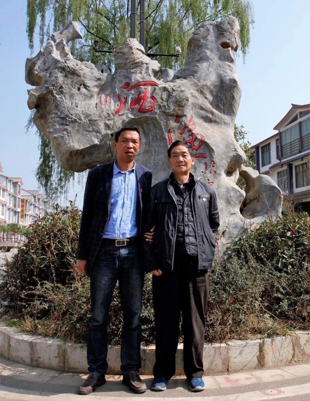 锦逸书画研究会秘书长赵声贵与张正华老师在题有“洒渔”两字的假山前合影。