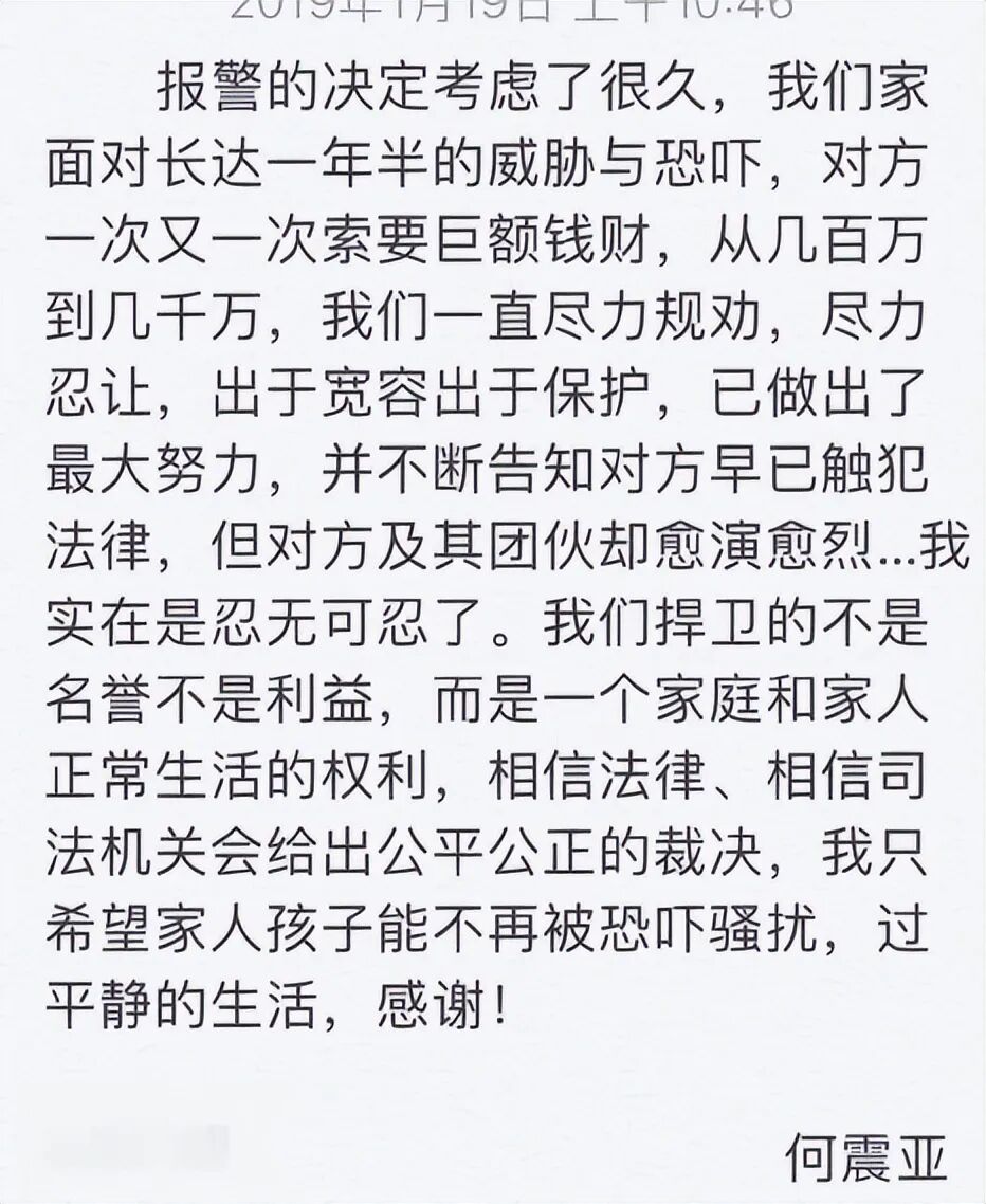 就连吴秀波之妻何震亚亦出面,针对“敲诈勒索”一事作出回应。