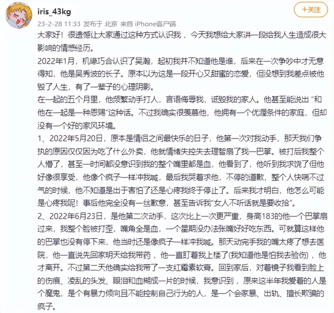 2023年,一位自称吴瀚前女友的网友在社交媒体上发文爆料。