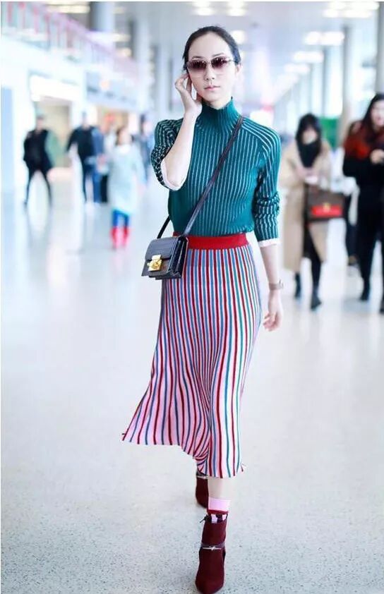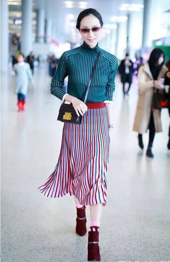 韩雪的发际线很美,而且也很喜欢将自己的发型给盘起来,这样显得更加优雅和女人味,而且韩雪还非常喜欢戴墨镜,优雅女人必不可的单品。几乎每一次现身机场,都会戴上墨镜,很美很有女人味。这一次现身机场的韩雪,着实太美了,身穿一身的条纹装,显得好高挑精致。一件青色条纹状配上红色的条纹裙,都用白色的作为点缀色,精致而又高贵,时尚又大雅。