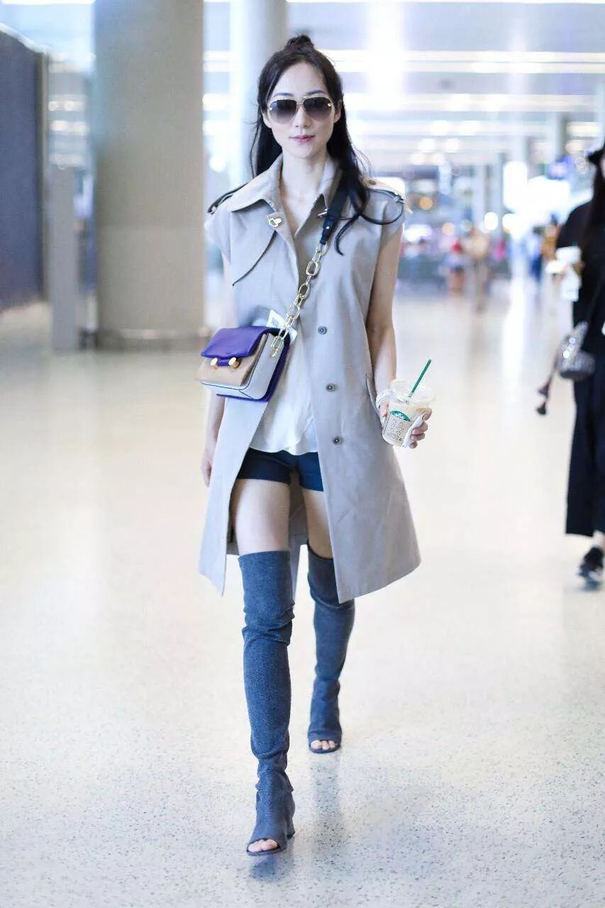 韩雪家庭背景很强,生活却十分低调,穿搭上也都展示出淑女的形象,不愧是名门贵族的出身的女人。一举一动都显得这么优雅,穿搭朴素感优雅十分。机场私服穿搭很显得很朴素,但是高贵优雅的气质一点不拉下,韩雪身穿一件无袖的灰色的风衣,内搭白色的T恤,下身穿上热裤,一双修长美腿亭亭玉立,配上一双深蓝色的过膝靴,显得腿好修长,真不愧是170cm身高的女人,太有魅力了!