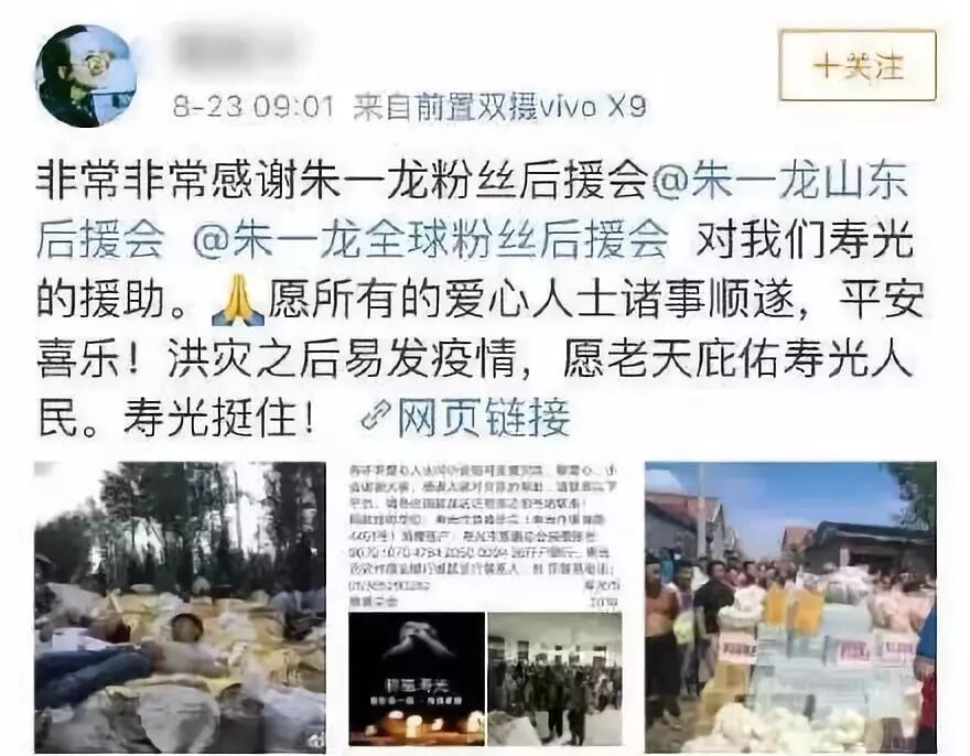灾难无情人有情,面对近期发生的山东寿光水灾事件,龙哥的粉丝后援会也做出回应,捐款捐物,贡献自己的一份绵薄之力。