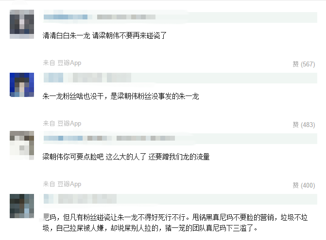 居老师的纯粉甚至在豆瓣上说,梁朝伟在靠朱一龙洗白:清清白白朱一龙,请梁朝伟不要再来碰瓷了。