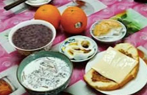 杂粮馒头(杂粮粥)+鸡蛋(牛奶)+水果(蔬菜); 青菜肉丝汤面(粉); 面包+火腿(牛奶)+水果等。