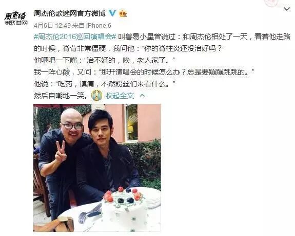 我们先来看下金羊网4月7日报道: 6日中午,周杰伦歌迷网官方微博晒出一张周杰伦和叫兽易小星的合影,配文中提及了一直让粉丝们非常心疼的脊柱炎:“治不好的,唉,老人家了。”易小星心酸地问开演唱会需要蹦蹦跳跳的时候怎么办,周杰伦自嘲一笑:“吃药,镇痛,不然粉丝们来看什么。”不少网友留言表示心痛。