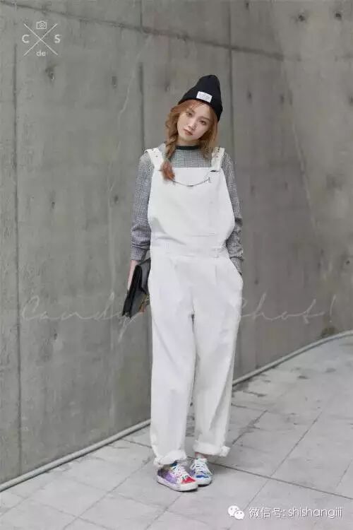宽松的背带裤颜色太素,脚下就选双色彩缤纷的帆布鞋