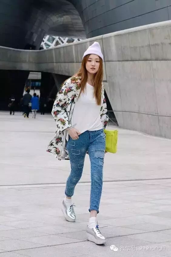 灰色系的丹宁Look,配个花色的大手包是不是很洋气?