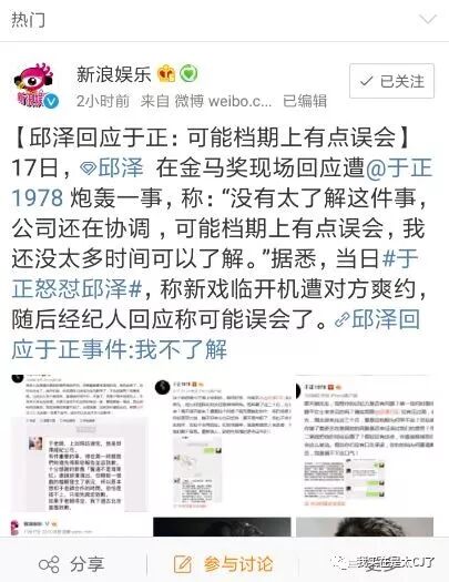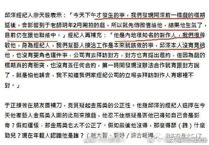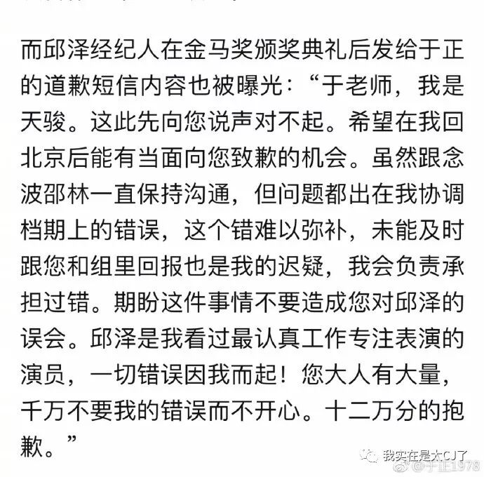 今天一则“邱泽经纪人在金马奖颁奖典礼后发给于正的道歉短信”也曝光,在短信中,邱泽方先是道歉,还说回北京后回向于正当面致歉。然后说所有的错误都是自己的错,邱泽是个好演员,让于正“大人有大量,千万不要我的错误而不开心”