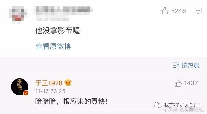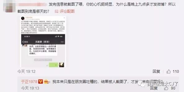 而对于自己六点多截图,九点多发微博的时间上的质疑,于正也回复说:本来只想在朋友圈吐槽的。