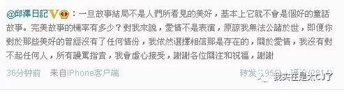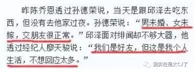 当时陈乔恩和外籍男友还藕断丝连,被媒体拍到陈乔恩夜宿邱泽家的时候,陈乔恩马上宣布“已分手”来替邱泽开脱,并且也没有承认两人的关系。