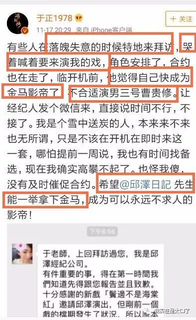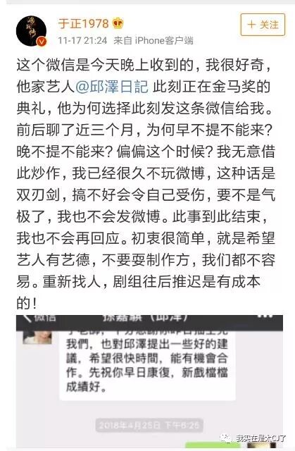 接下来于正又发了一条微博接着怼:说“放鸽子”的微信是今晚才收到的,而邱泽此刻正在金马奖典礼上,而于正认为邱泽选择这个时候发微信给他,让他很不能理解。