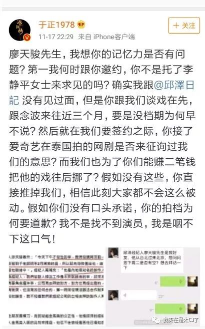 在这则微博下面,于正放出邱泽经纪公司跟他的聊天记录,在对话中,邱泽方声称,由于一个戏的档期发生了状况,所以不能出演之前答应于正的一部戏