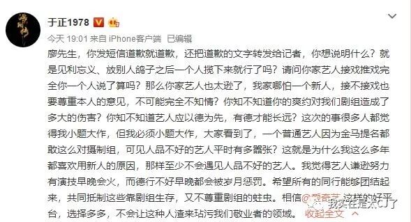 而面对这个道歉短信,于正似乎更来火,今天七点多的时候,继续发了一条微博怼:道歉就道歉,还把道歉文字发给记者,想说明什么?
