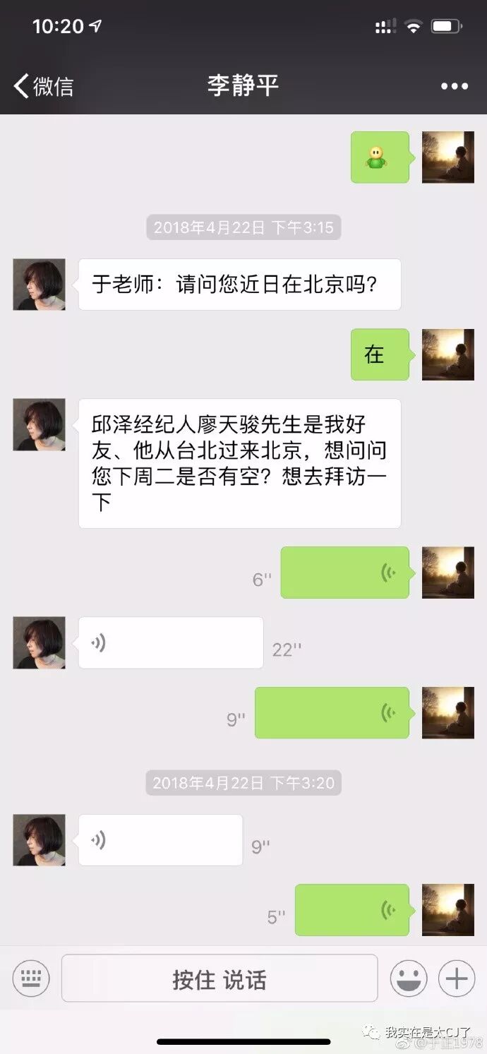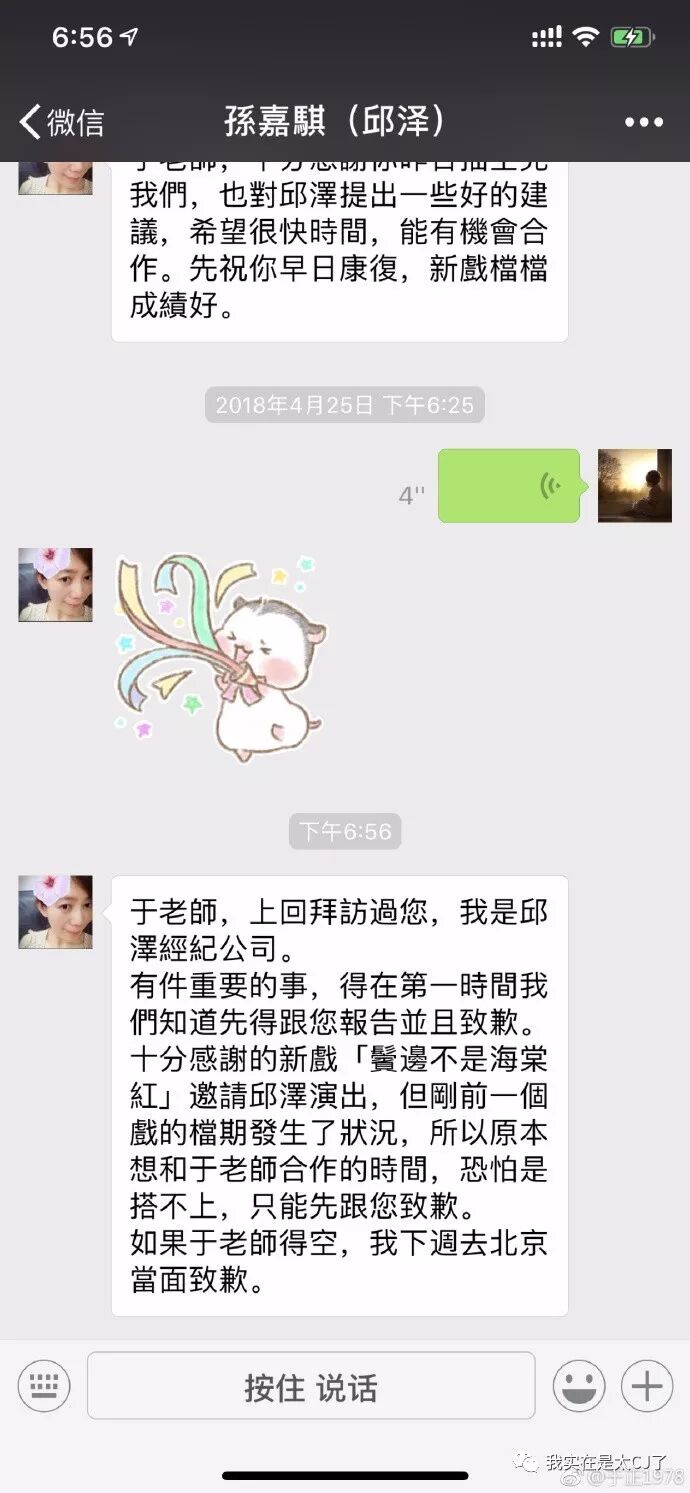 在这条微信下,于正又放出之前邱泽经纪方给他发微信的完整截图,时间显示是昨天下午6:56,